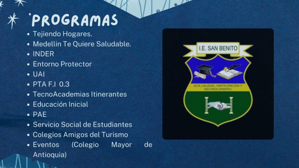 Somos una institución educativa oficial urbana del calendario A, ubicada en el centro de la ciudad de Medellín, Antioquía, que ofrece educación en los niveles de Preescolar (con grado Jardín), Básica Primaria (incluye los modelos flexibles Brújula y Aceleración del Aprendizaje), Básica Secundaria (implementa el modelo educativo flexible Pensar) y Media Técnica en Turismo (incluye media académica para casos especiales), en las Jornadas Única, Mañana y Tarde, con ofertas complementarias orientadas hacía la formación integral (deportes, música, teatro, danza y tecnología), con gran vocación humanística, en la cual procuramos a todos los integrantes de la comunidad educativa las mejores condiciones de bienestar, calidad e inclusión. Siendo nuestra misión “Formar ciudadanos en estrategias para la vida que les permitan enfrentarse a su realidad”, y nuestro lema institucional es: «Por una escuela promotora de paz, talentos y esperanzas, educamos para la vida con amor, seguridad y confianza: Juntos es mas fácil y mejor«.